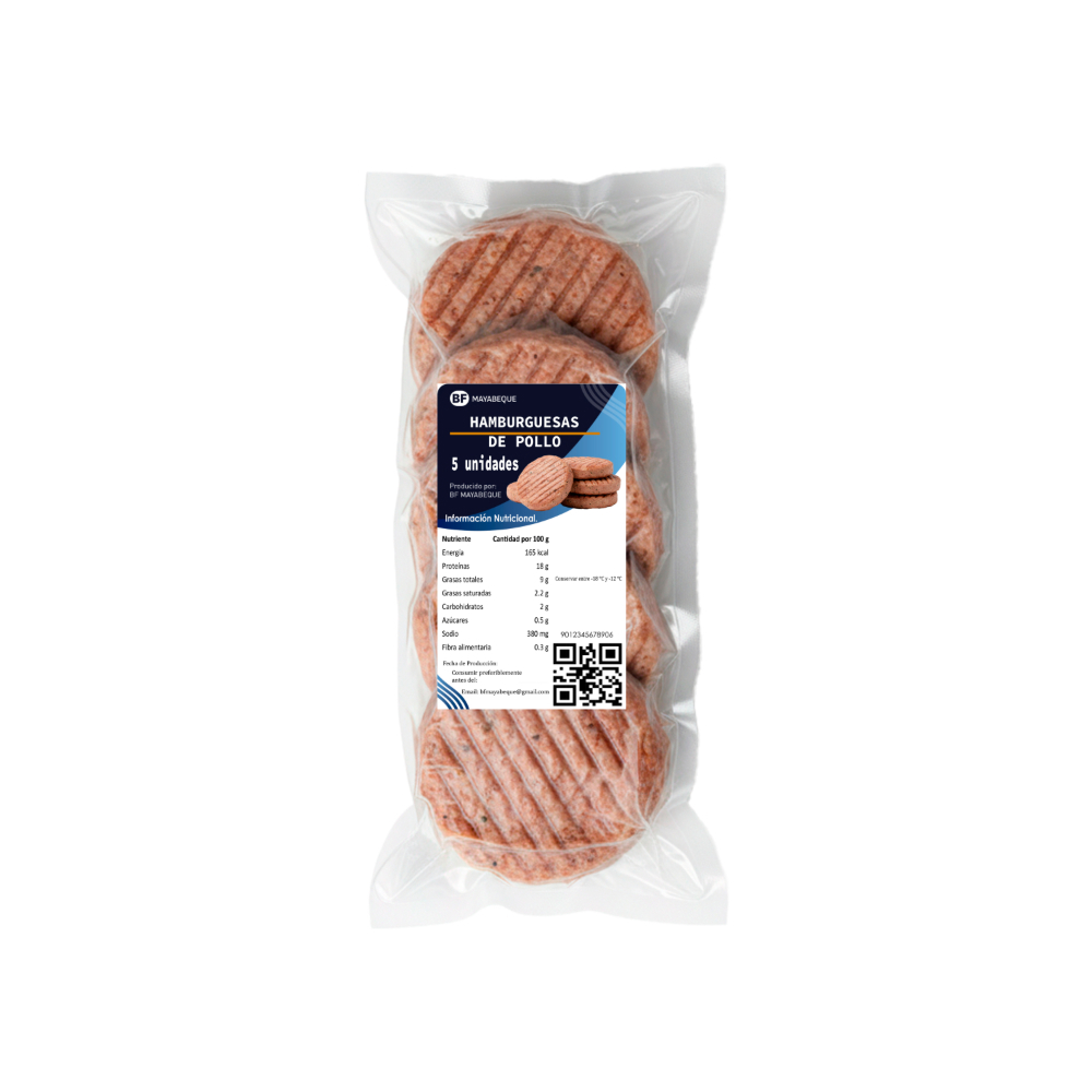Paquete de 5 hamburguesas de pollo de 80 g cada una.