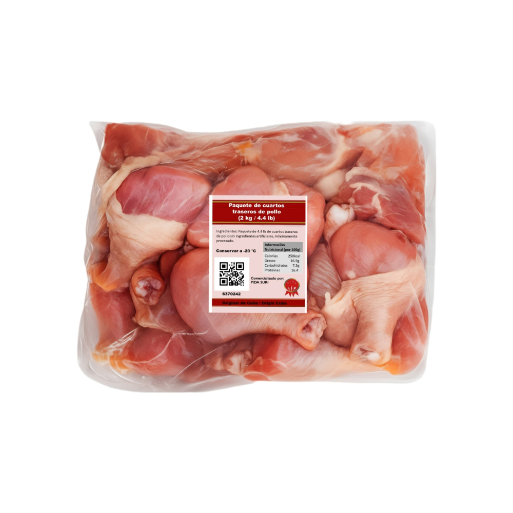 Ingredientes: Paquete de 4.4 lb de cuartos traseros de pollo sin ingredientes artificiales, mínimamente procesado.
