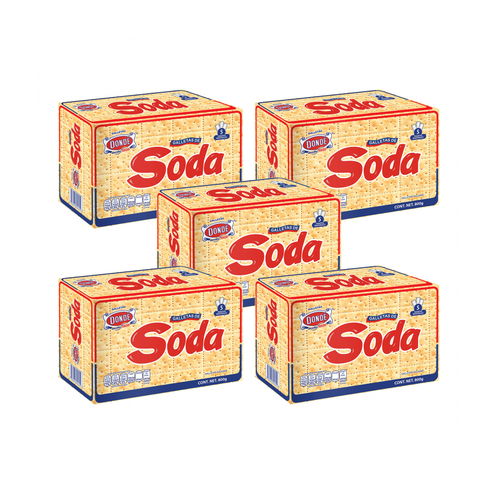 Cada caja contiene 5 paquetes de galletas de soda Dondé.
