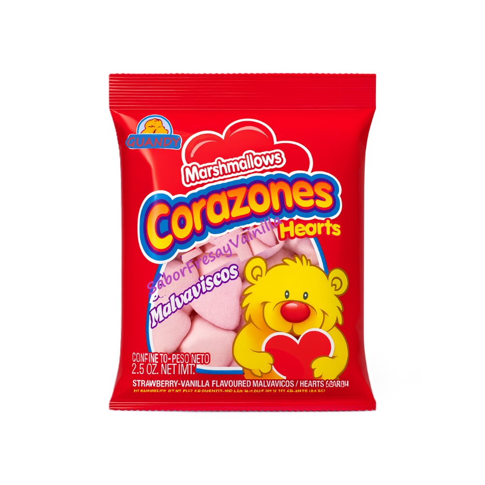 Malvaviscos en forma de corazón sabor vainilla y fresa Guandy (71 g / 2.5 oz)