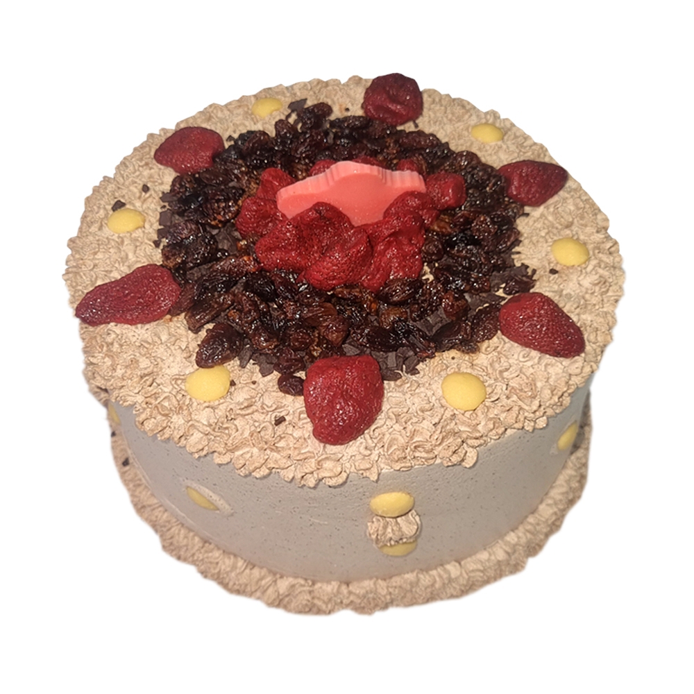 Cake redondo de nata de chocolate con panetela de vainilla y relleno doble de nata de chocolate, decorados con una lluvia de grageas de chocolates, pasas, fresas y figura de cobertura de chocolate negro y blanco de acuerdo a disponiblidad de materias primas. Para 12 Comensales.