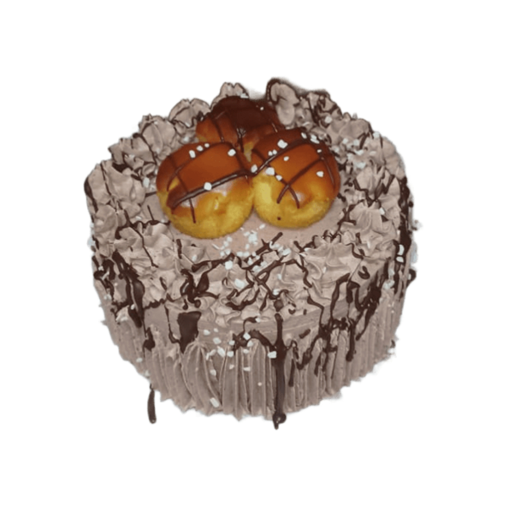 Panetela de capuchino relleno de crema de mantequilla y chocolate. Cubierta de nata de chocolate y cabezotes.