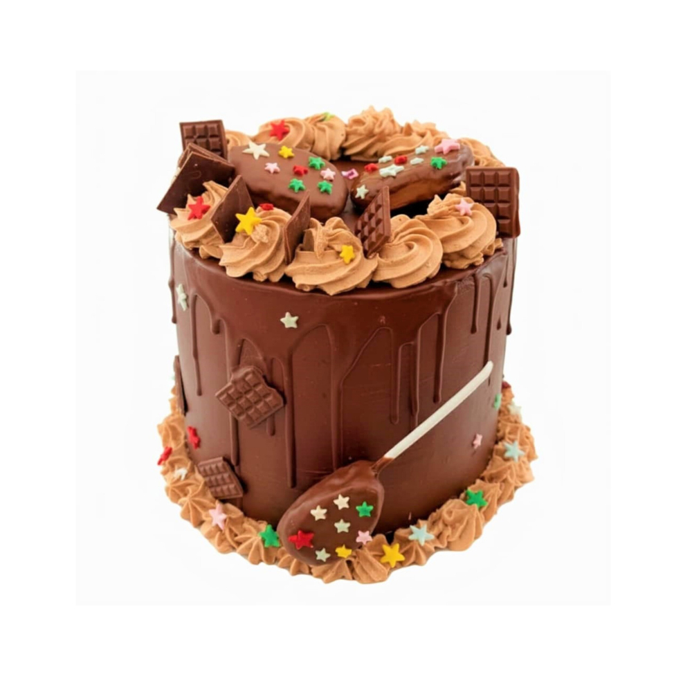 Panetela de vainilla, relleno de pasta bombón y cobertura.