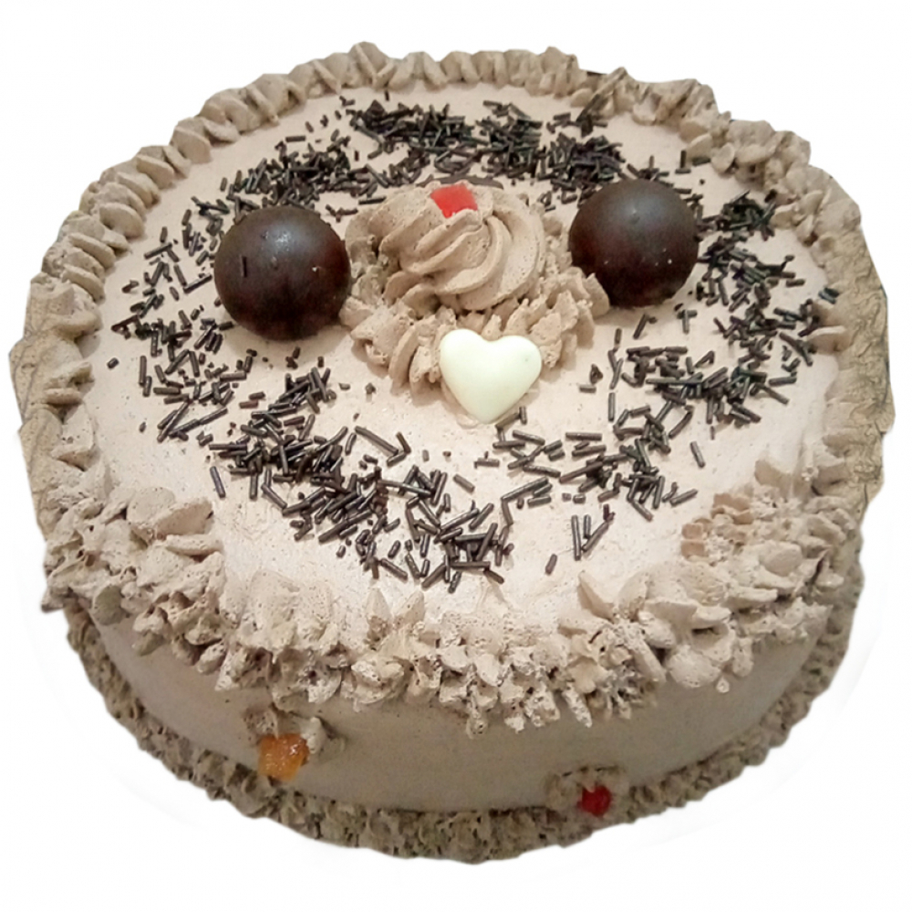 Cake redondo de nata de chocolate con panetela de vainilla y relleno doble de nata de chocolate, decorado con una lluvia de grageas de chocolate y figuras de cobertura de chocolate negro y blanco, de acuerdo a la disponiblidad de insumos.