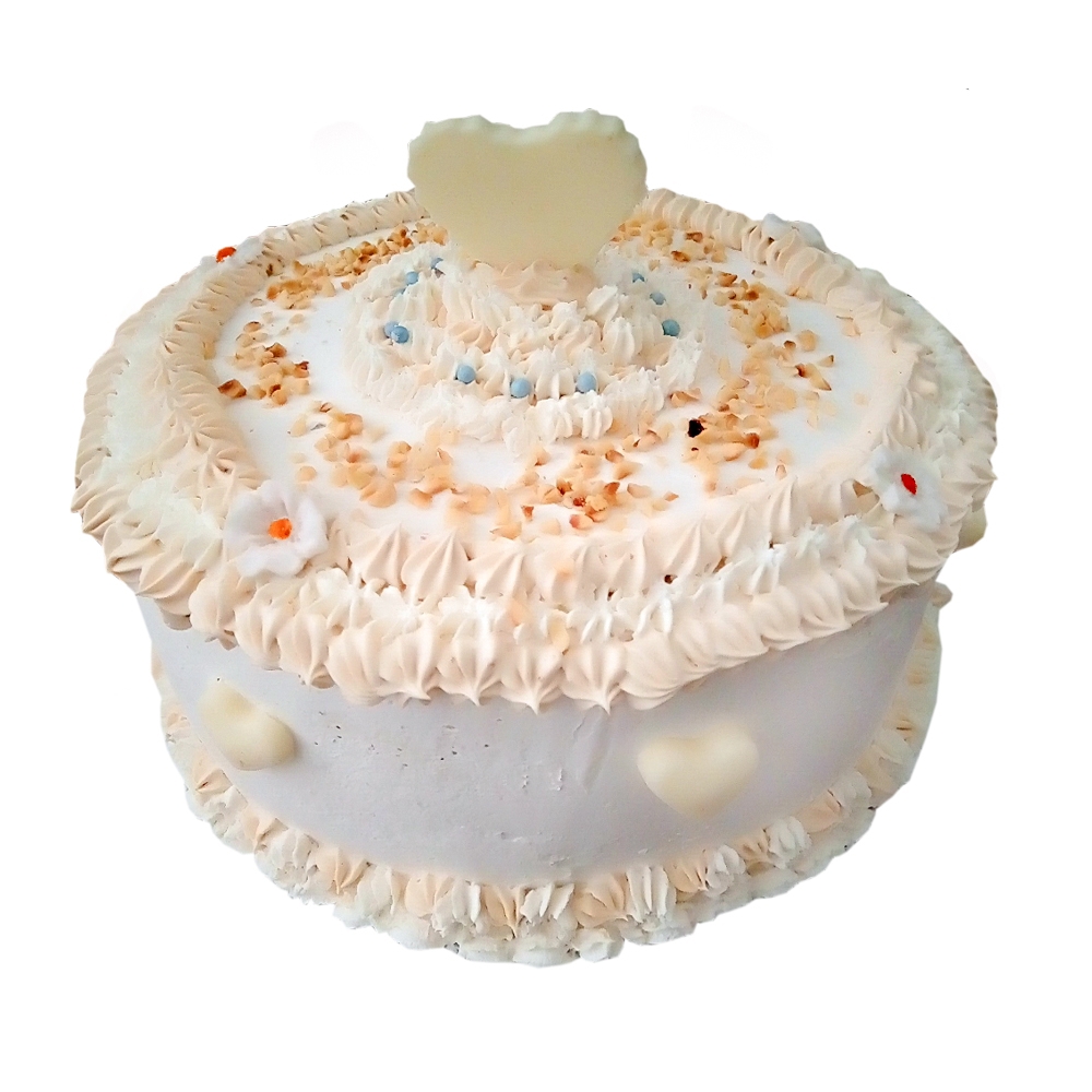 Cake redondo de nata de vainilla y dulce de leche con panetela de vainilla y relleno doble de nata de vainilla, decorados con una lluvia de grageas de chocolates y figura de cobertura de chocolate negro y blanco de acuerdo a disponibilidad de materias primas. Para 12 comensales.