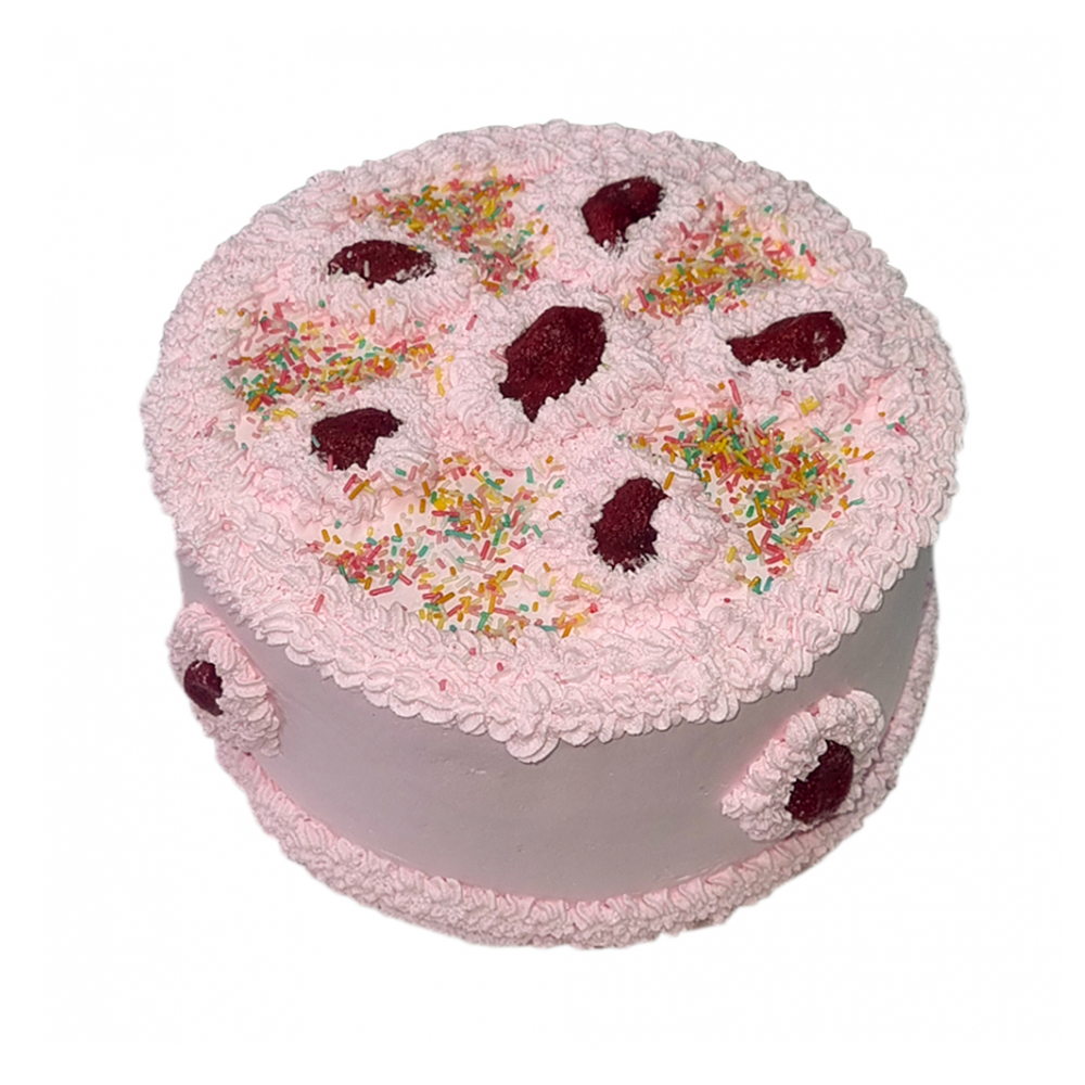 Cake redondo de nata de fresa con panetela de vainilla y relleno doble de nata de fresa, decorados con una lluvia de grageas de azúcar y fresas en conserva.