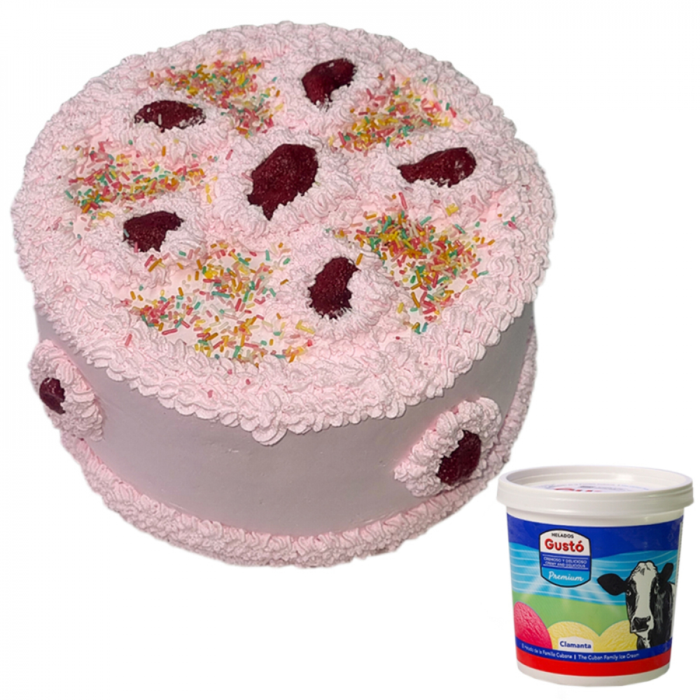 (1) Cake redondo de nata de fresa con panetela de vainilla y relleno doble de nata de fresa, decorados con una lluvia de grageas de azúcar y fresas en conserva. Para 12 comensales.