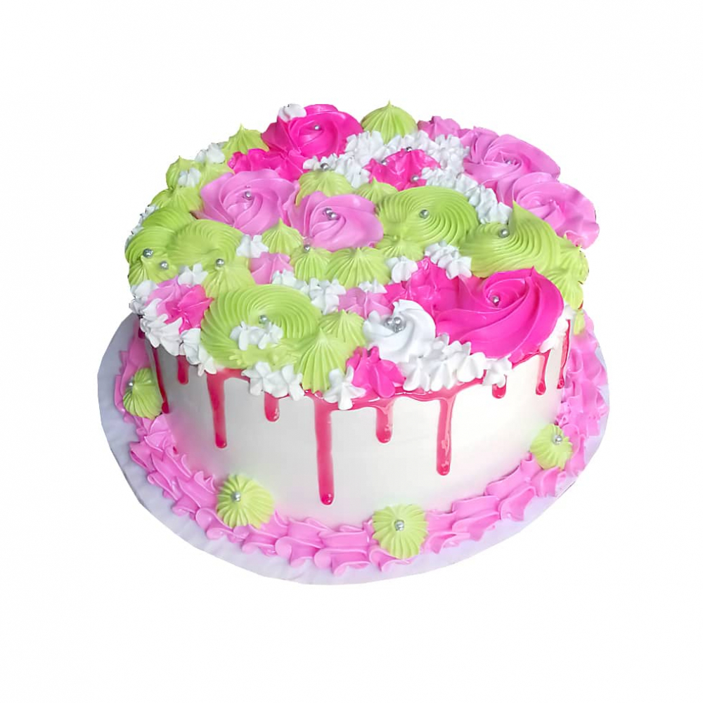 Cake de 21 cm con panetela de vainilla, relleno con crema de fresa, cubierto con merengue saborizado, perlas comestibles y jalea de fresa.