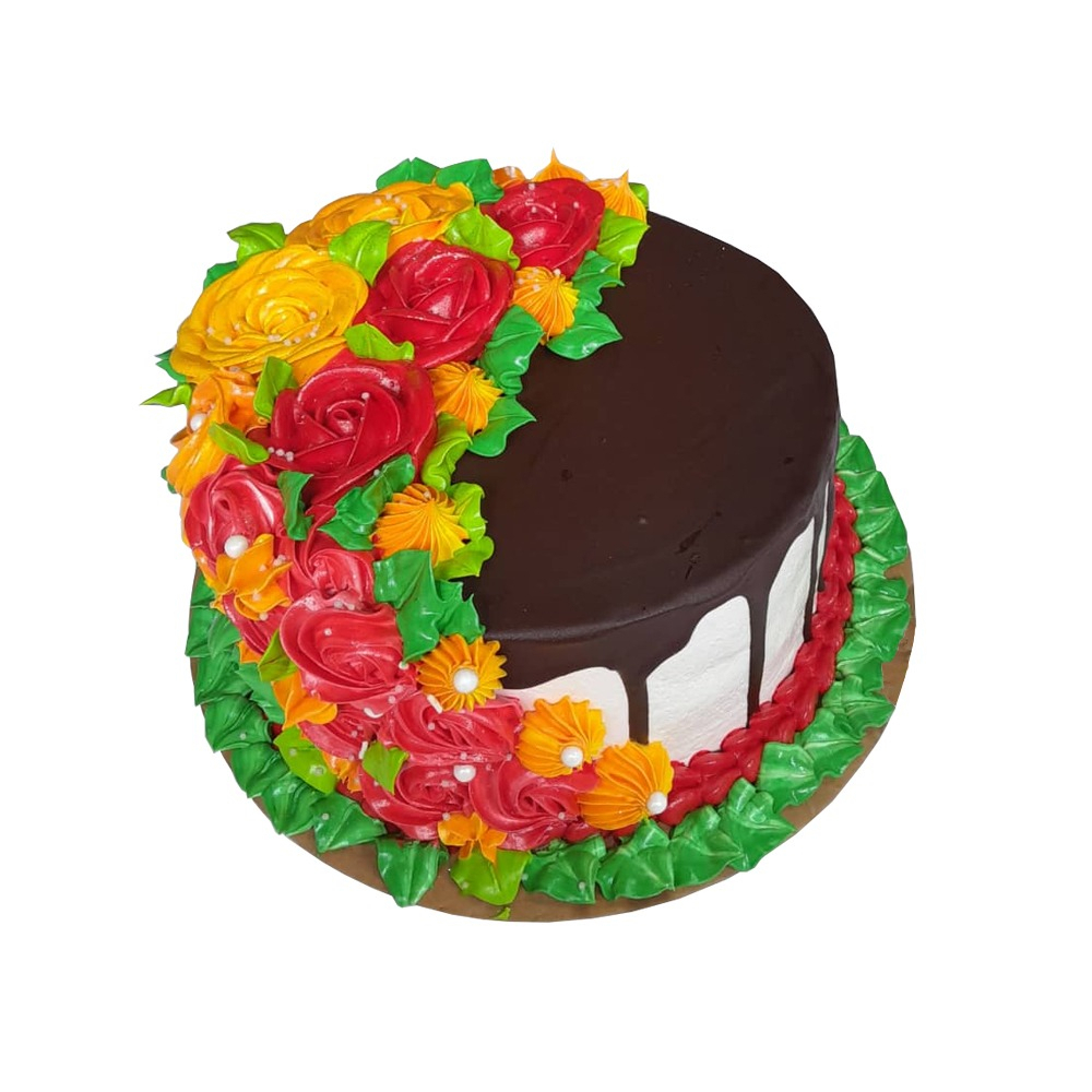Cake de 21 cm de diámetro x 10 cm con panetela de chocolate, relleno de crema de chocolate, cubierto con merengue saborizado y bombón.