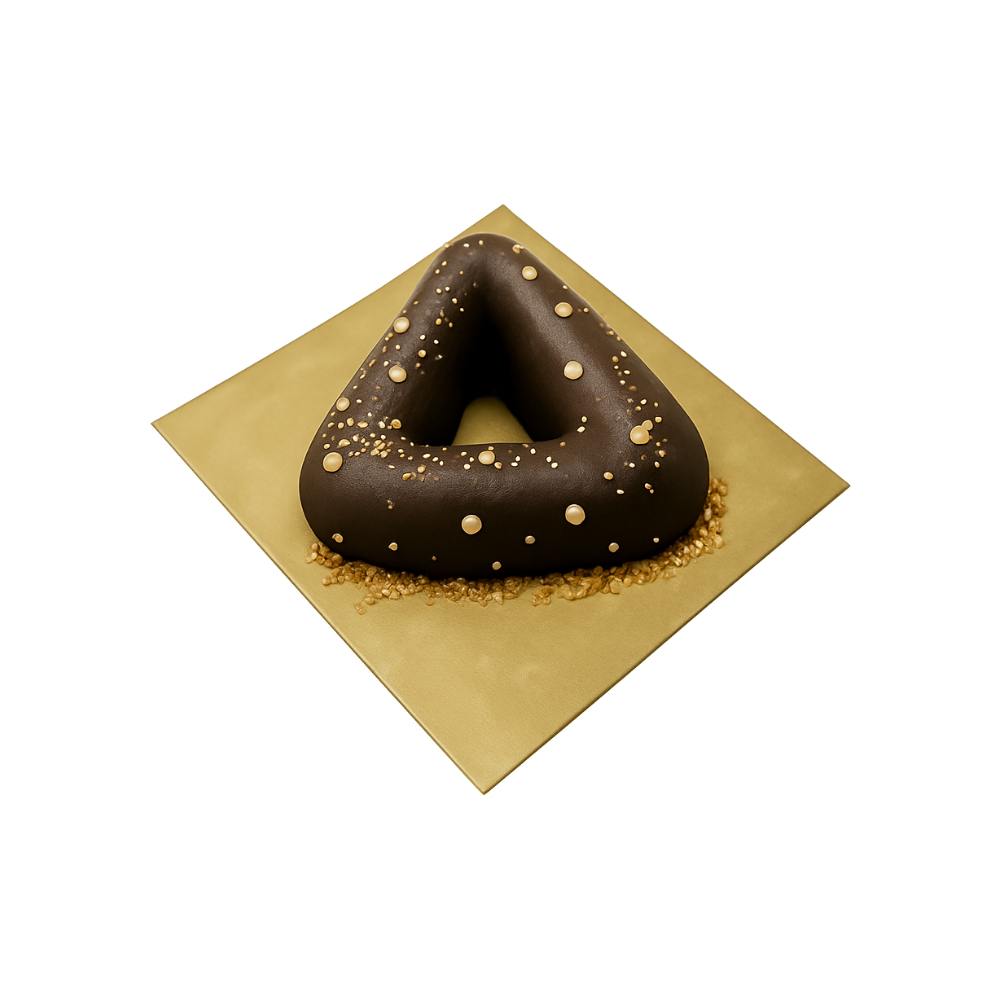 Cake en forma de triángulo, panetela vainilla, sin relleno porque lo cubre una cobertura de chocolate fundente, salpicado con fruto seco (maní y almendras laminadas) con aromas de vainilla.