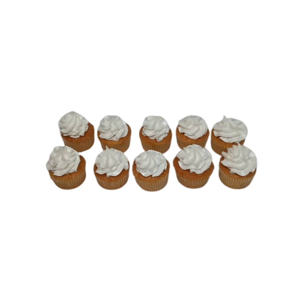 (10 U) Cupcakes de vainilla de 50 g cada uno, elaborados a partir de una base de panetela de vainilla decorados con merengue italiano.