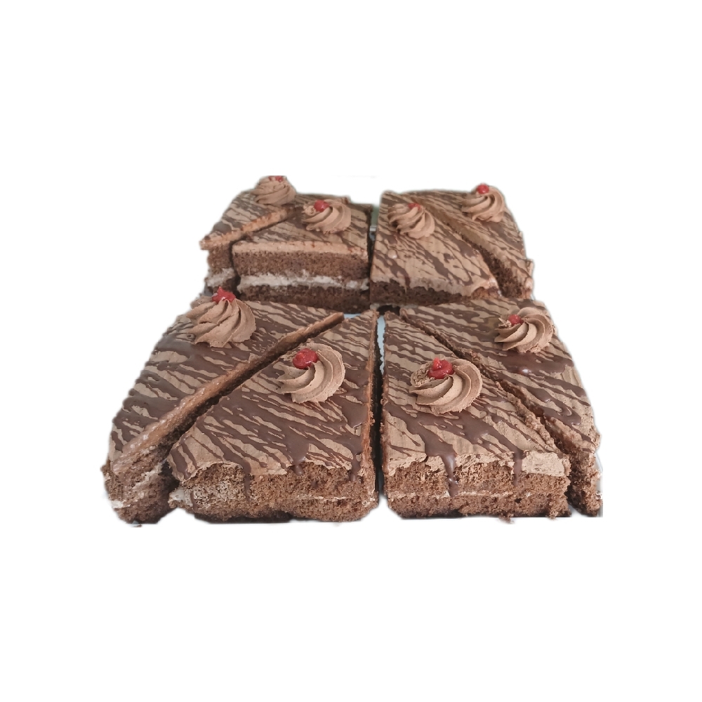 Ocho cuñas de panetela de chocolate, rellenas y cubiertas de merengue de chocolate, mezclado con cobertura de chocolate bombón, y decorado con hilos de chocolate bombón. Ingredientes: Harina, cocoa, azúcar, huevo, cobertura de chocolate bombón.