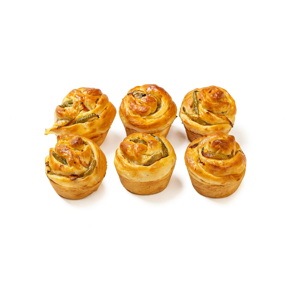 Panecillos de miga blanca y esponjosa horneados en espiral, combinando las notas dulces de la cebolla y el frescor vegetal del pimiento. Perfectos para servir tibios, como snack salado o para acompañar sopas y ensaladas.