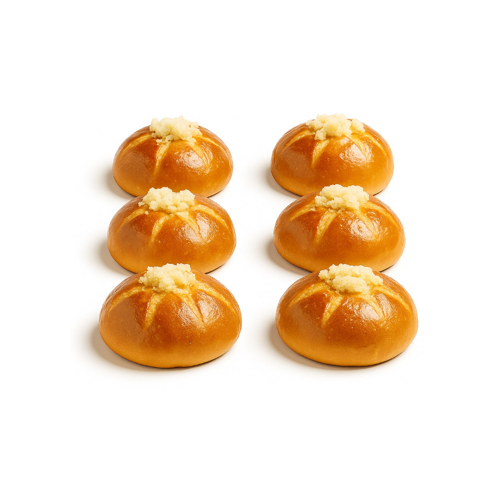 Pan redondo, suave, miga blanca y esponjosa que contiene una ligera explosión de azúcar, manteca y harina en la parte superior, ideal para consumir como postre.