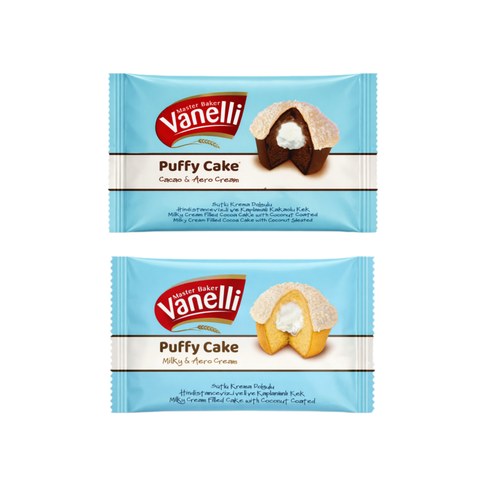 Pastelitos de vainilla y chocolate rellenos de crema y cubiertos de coco Puffy Cake Vanelli