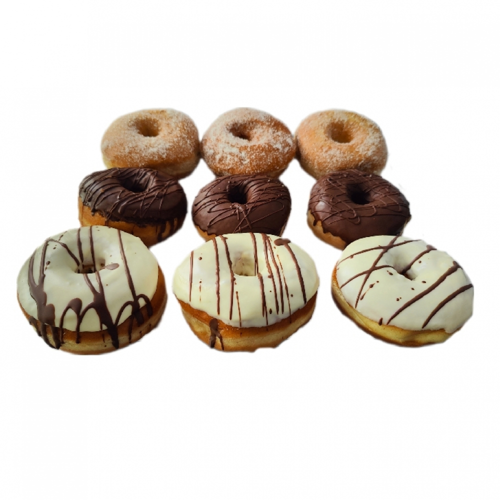 Surtido de 3 donas de azúcar, 3 donas de chocolate y 3 donas de chocolate blanco.