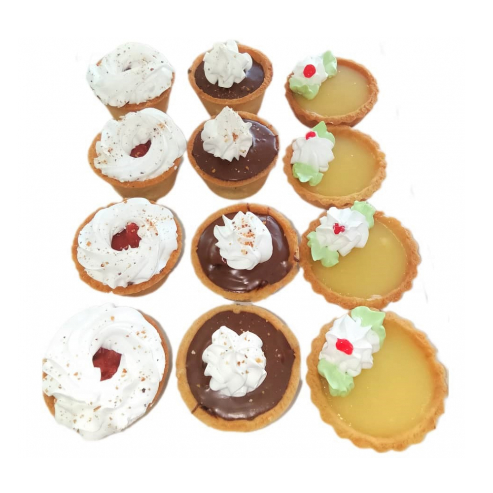 Surtido de 12 tartaletas, distribuidas en 4 de limón, 4 de guayaba y 4 de bombón.