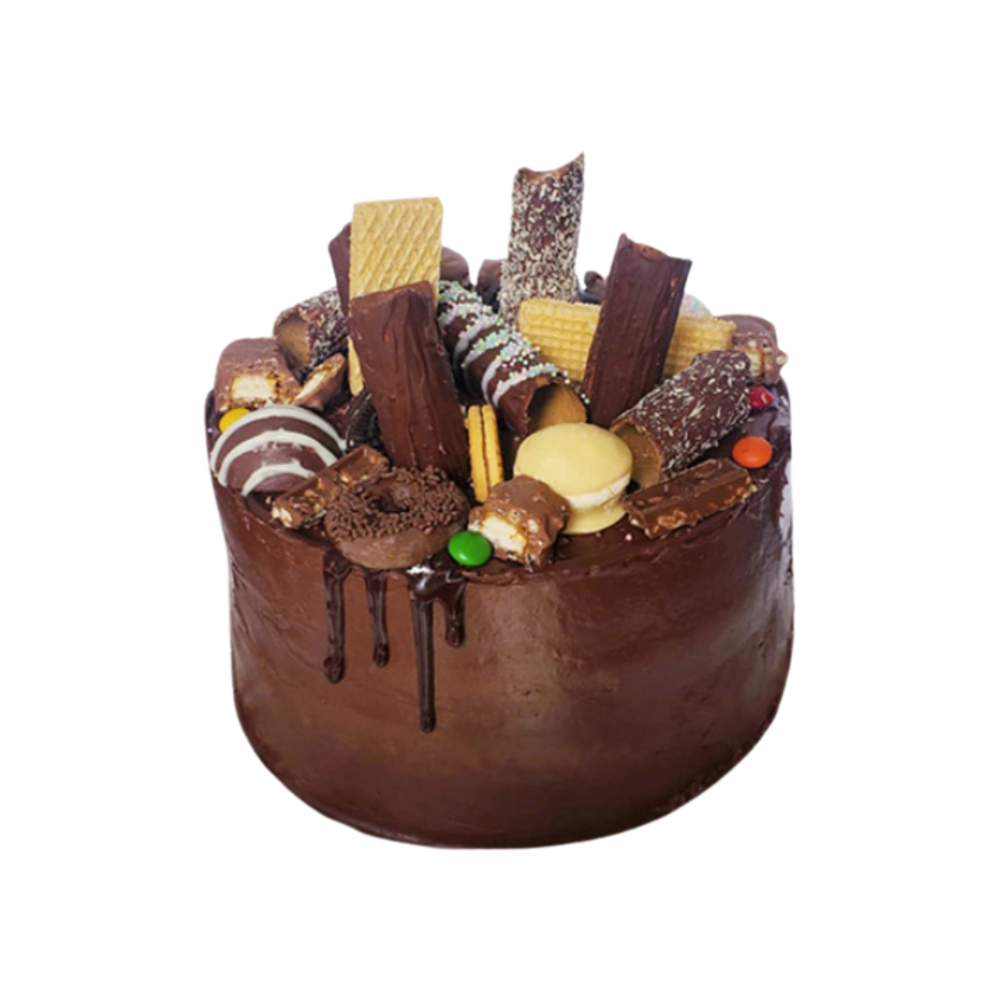 Tarta de 20 cm de diámetro por 14 cm de alto (sin considerar la decoración) con 4 masas de vainilla y 3 capas de relleno de crema bombón (chocolate fundido con leche condensada). Vestida con chocolate bombón fundido. Decorada con bombones variados y bastones de chocolate, perlas de azúcar, galletas variadas con crema, sorbetos, grajea, chocolate blanco, 2 bombones marca Bon Bon (uno negro y uno blanco), 1 peter Nikolo, 1 snack, 2 mini donas originales (una de chocolate negro y otra de chocolate blanco) y M&M.