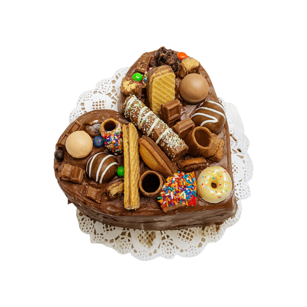 Decorada con bombones variados y bastones de chocolate, perlas de azúcar, galletas con crema, sorbetos, grajea, chocolate blanco, 2 bombones marca Bombón (uno negro y uno blanco), 2 mini donas originales (una de chocolate negro y otra de chocolate blanco), 1 peter Nikolo y 2 snacks.