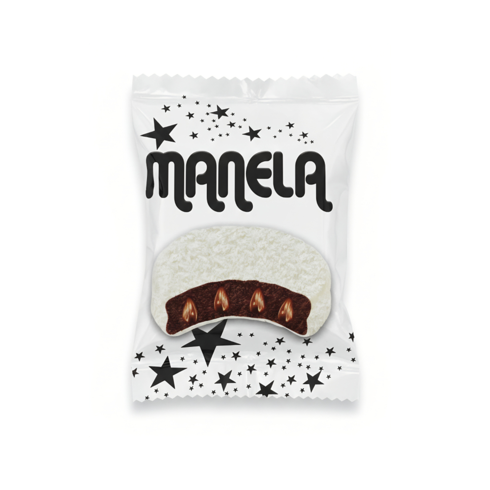 Tarta de chocolate rellena de chocolate con cobertura de chocolate blanco y coco Manela (50 g / 1.76 oz)
