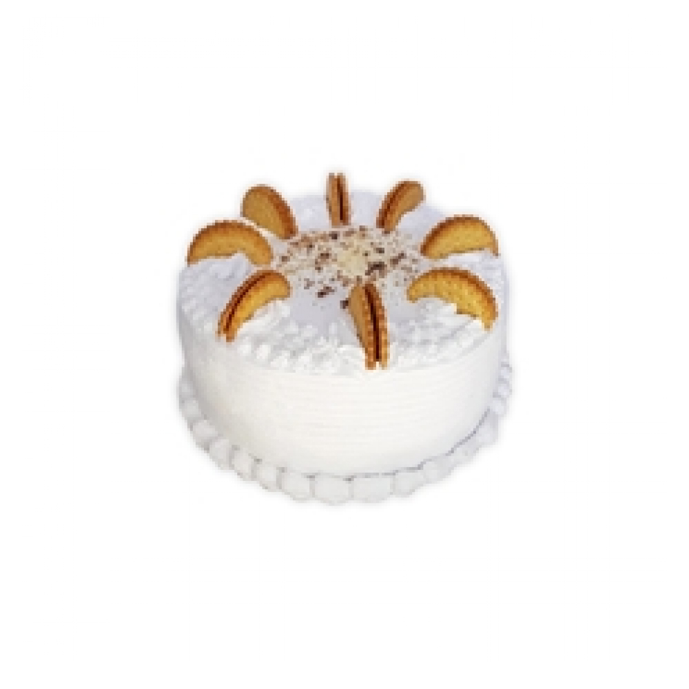 Tarta de 20 cm de diámetro por 8 cm de alto (sin considerar la decoración), con 3 masas de vainilla y 2 capas de relleno de crema tiramisú (con 2 capas de cacao amargo). Vestida con nata. Decorada con galletas rellenas con crema de chocolate o con chispas de chocolate.