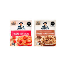 Combo de cereales de desayuno Quaker sabor fresa con crema (35 g / 1,23 oz) + nueces, pasas y dátiles (40 g / 1,41 oz)