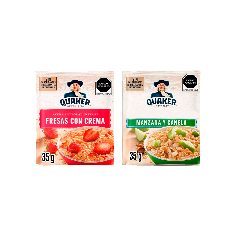 Combo de cereales de desayuno Quaker sabor fresa con crema (35 g / 1,23 oz) + manzana y canela (40 g / 1,41 oz)