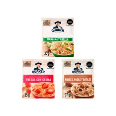 Combo de cereales de desayuno Quaker sabor nueces, pasas y dátiles (37 g / 1,30 oz) + manzana y canela (40 g / 1,41 oz) + fresas con crema (35 g / 1,23 oz)