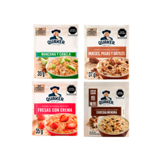 Combo de cereales de desayuno Quaker sabor nueces, pasas y dátiles (37 g / 1,30 oz) + chocoalmendra (40 g / 1,41 oz) + fresas con crema (35 g / 1,23 oz) + manzana y canela (40 g / 1,41 oz)