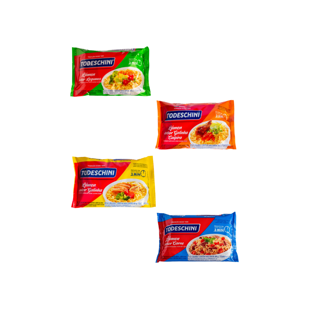 Combo de Fideos instantáneos sabor a legumbres Todeschini (85 g / 2.99 oz) + Fideos instantáneos sabor a pollo Todeschini (85 g / 2.99 oz) + Fideos instantáneos sabor a pollo de corral Todeschini (85 g / 2.99 oz) + Fideos instantáneos sabor a carne Todeschini (85 g / 2.99 oz)