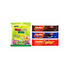 Chupa chupas con relleno de chicle sabor ácido intenso Colombina (170 g / 6 oz) + Galleta dulce con relleno sabor a fresa Marilan (80 g / 2.82 oz) + Galleta dulce sabor chocolate con relleno sabor a vainilla Marilan (80 g / 2,82 oz) + Galleta dulce sabor chocolate con relleno sabor a chocolate Marilan (80 g / 2,82 oz)