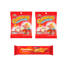 Gomitas corazones Guandy (2 x 20 g) + Galleta dulce con relleno sabor a fresa Marilan (80 g / 2.82 oz)