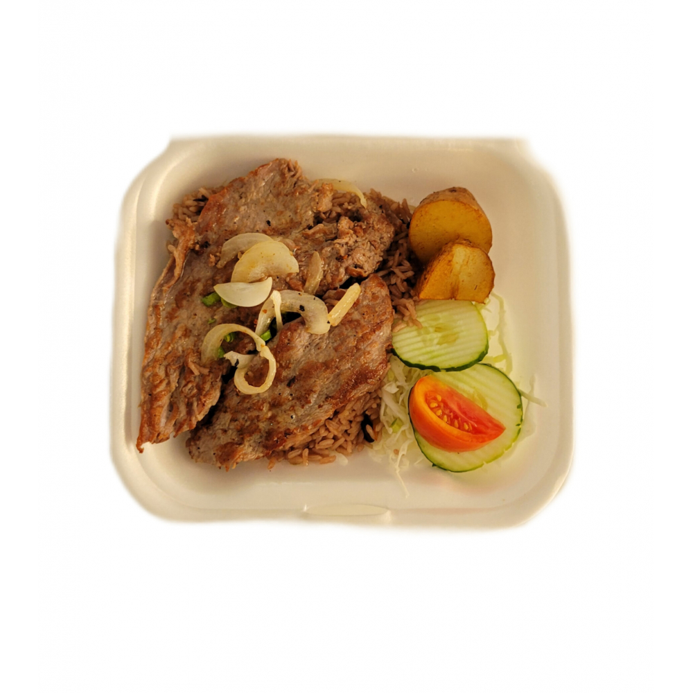 (1) Bistec de res con cebolla por encima (250 g / 8.81 oz) acompañado de: