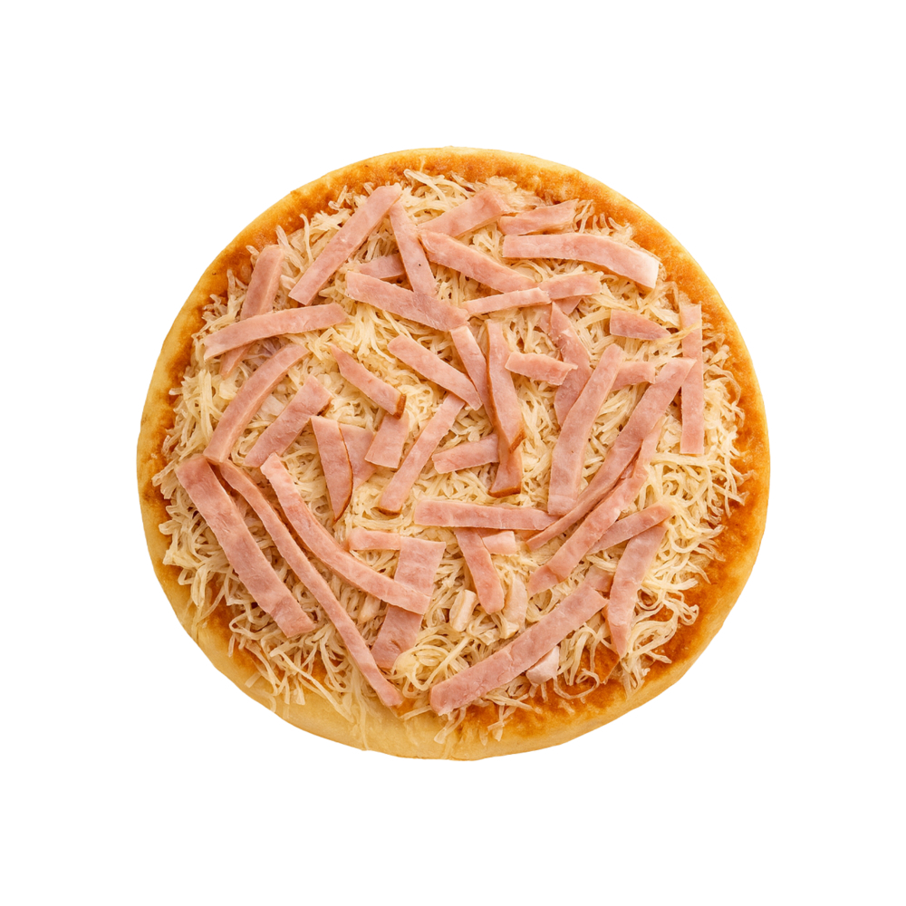 Masa suave y esponjosa, cubierta con salsa de tomate bien sazonada y una generosa capa de queso fundido. Lleva abundantes trocitos de jamón vicky, jugoso y sabroso, que se doran ligeramente en el horno.