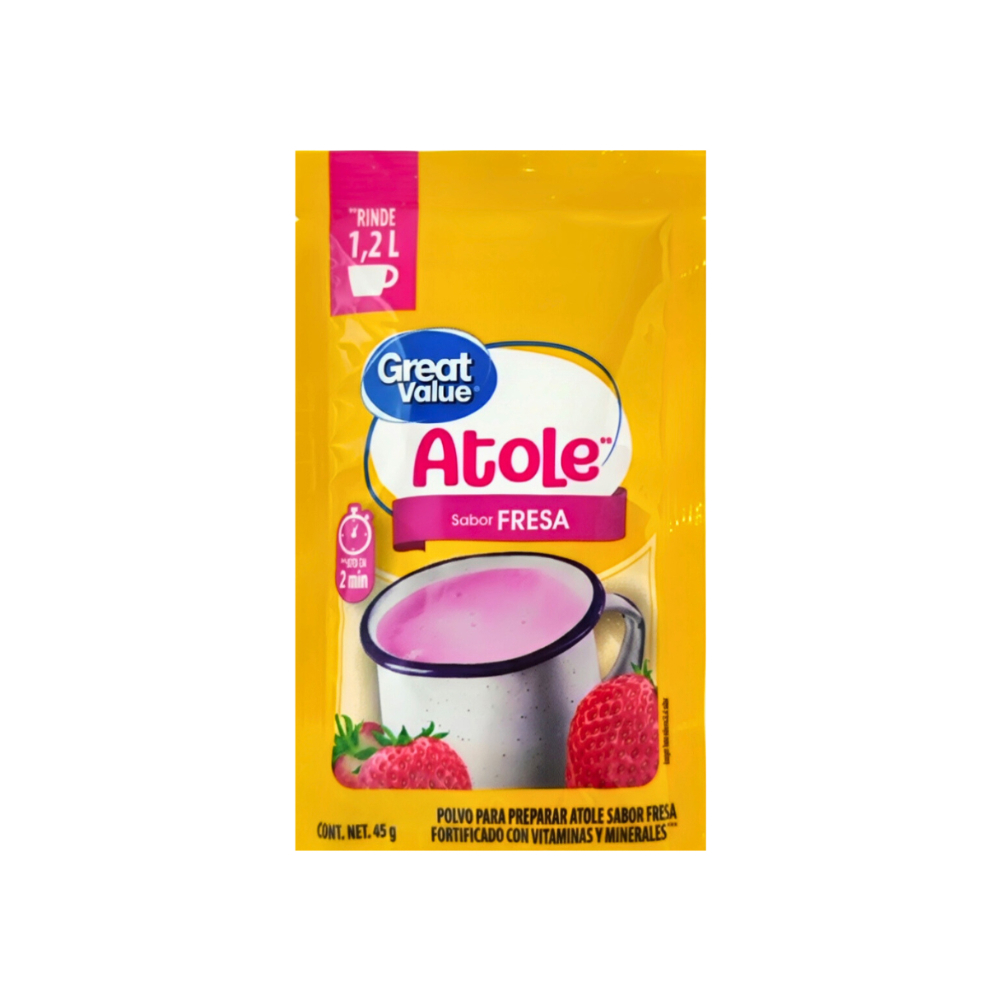Polvo para preparar atole sabor fresa fortificado con vitaminas y minerales Great Value (45 g / 1.59 oz)