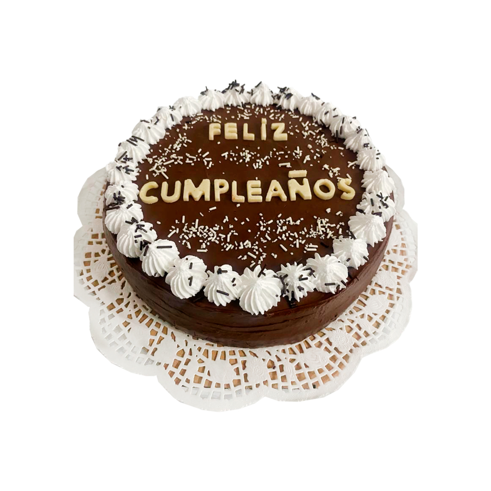 Tarta o cake perfecto para celebrar eventos o cumpleaños junto a la familia. Panetela de vainilla, rellena de crema de chocolate o de leche condensada, cubierta con cobertura de chocolate. Sus dimensiones son 23 cm de diámetro por 7 cm de altura (10 personas).