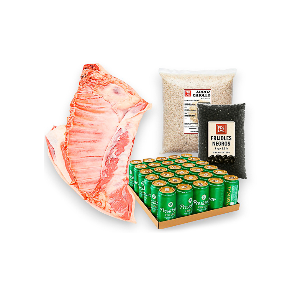 Celebra el fin de año con un combo completo para compartir: carne de cerdo ideal para hornear y servir jugoso, acompañado de arroz criollo y frijoles negros para el plato tradicional, y un pack de cerveza Presidente para brindar. Perfecto para cenas familiares, reuniones y fiestas.