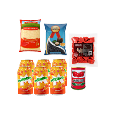 Arroz blanco de grano extra largo + Frijoles negros + Carne de res troceada + Pasta de tomate + Refresco gaseado sabor naranja