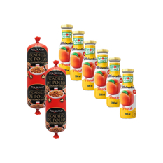 Carne mecánicamente separada de pollo condimentada + Jugo de melocotón