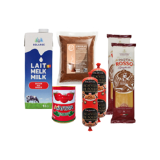 Chocolate natural en polvo + Leche entera + Pasta de tomate + Carne mecánicamente separada de pollo condimentado + Espaguetis