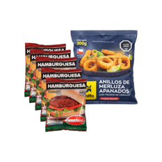 Combo: Anillos de merluza apanados con trozos de cebolla El Golfo (300 g / 10.58 oz)+Hamburguesa de carne vacuno (90 g / 3.18 oz)
