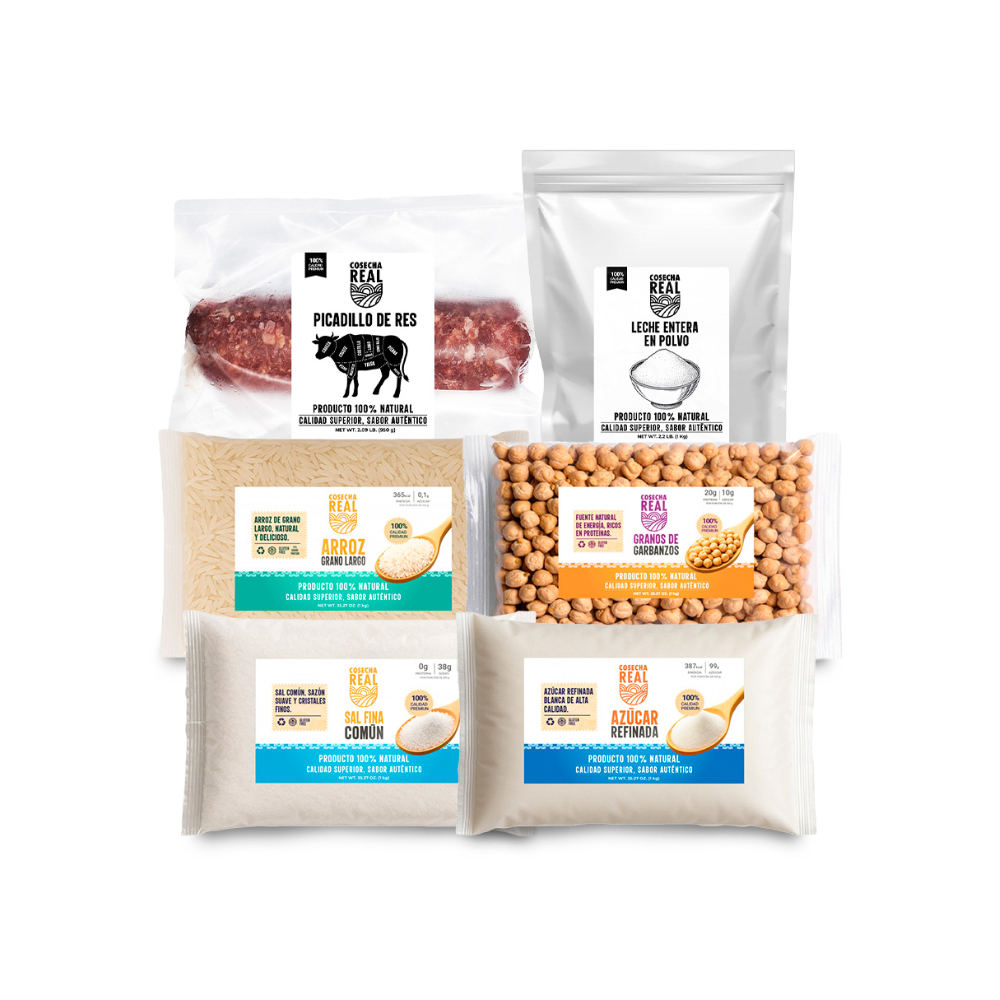 Combo básico esencial Cosecha Real #2: Picadillo de res + Arroz de grano largo + Azúcar refinada + Sal fina común + Leche entera en polvo + Garbanzos
