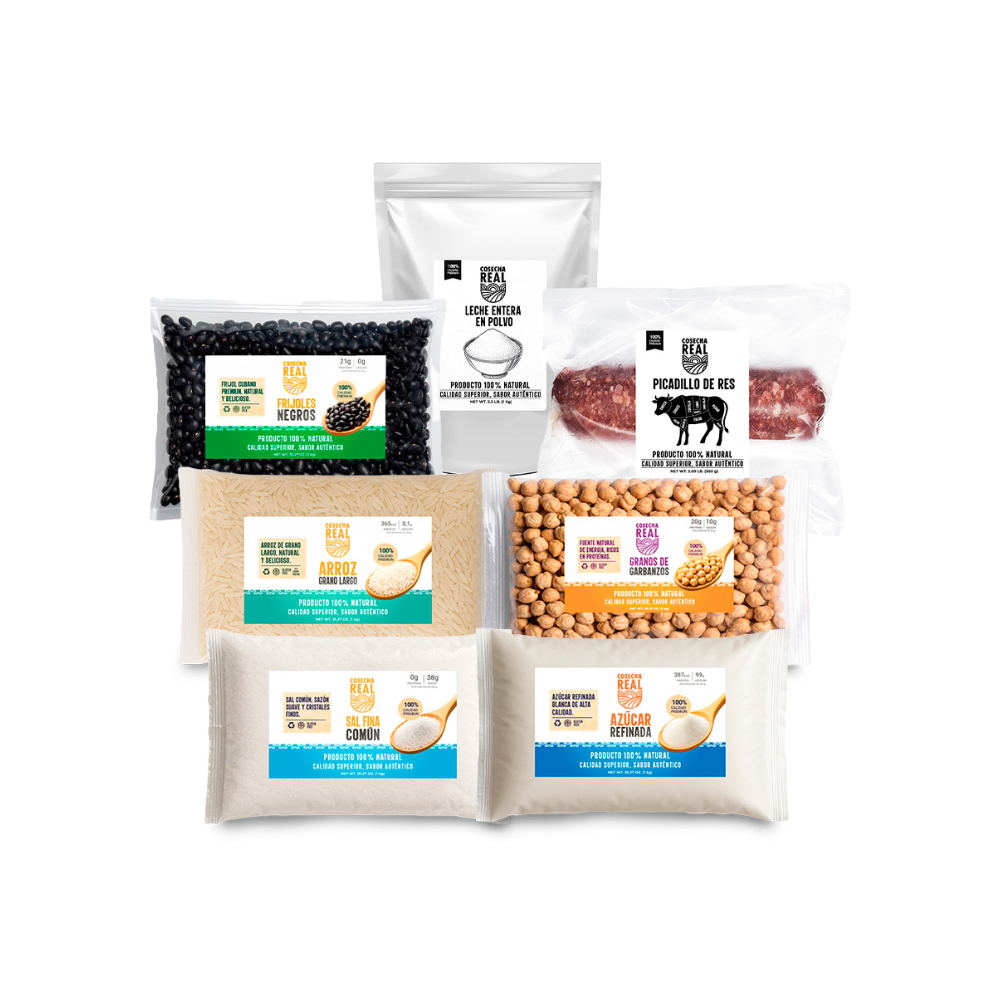 Combo básico esencial Cosecha Real #3: Picadillo de res + Arroz de grano largo + Azúcar refinada + Sal fina común + Leche entera en polvo + Garbanzos + Frijoles negros