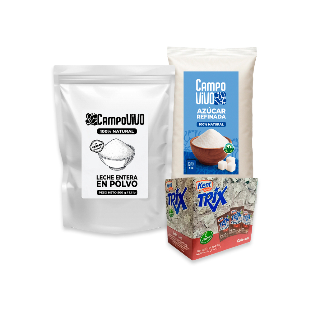 Combo Campo Vivo para desayuno: Leche entera en polvo + Azúcar blanca refinada + Caja de refresco en polvo sabor cola Trix