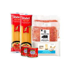Combo para espaguetis #12: Espaguetis Ridel + Pasta de tomate Burcu + Picadillo de cerdo Cosecha Real + Sal fina comúm Cosecha Real