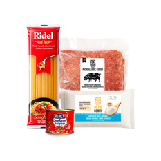 Combo para espaguetis #13: Espaguetis Ridel + Pasta de tomate Burcu + Picadillo de cerdo Cosecha Real + Sal fina comúm Cosecha Real
