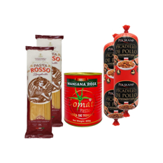 Espaguetis + Carne de pollo mecanicamente separada condimentada + Pasta de tomate