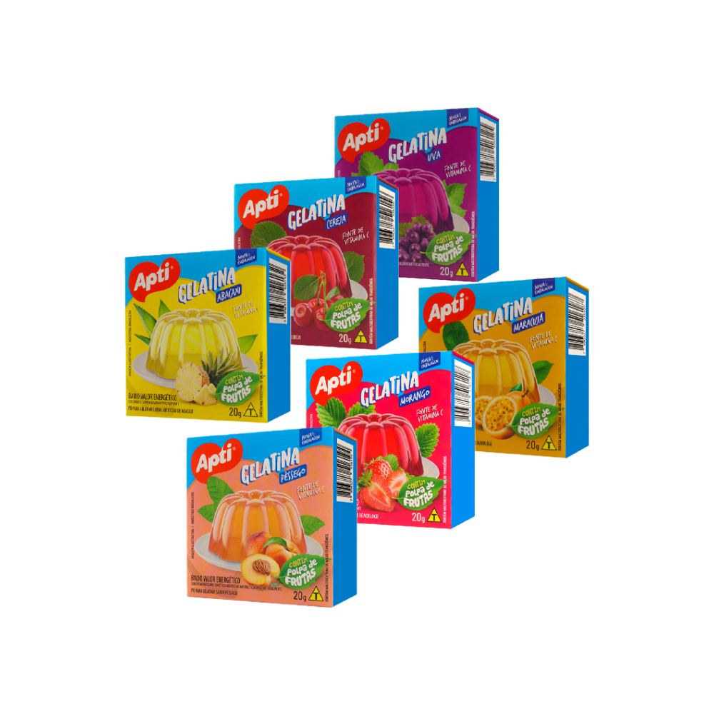 Gelatina sabor uva + Gelatina sabor piña + Gelatina sabor melocotón + Gelatina sabor maracuyá + Gelatina sabor fresa + Gelatina sabor cereza