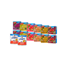 Leche condensada azucarada + Gelatina sabor uva + Gelatina sabor piña + Gelatina sabor melocotón + Gelatina sabor maracuyá + Gelatina sabor fresa + Gelatina sabor cereza