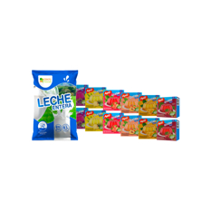 Leche en polvo + Gelatina sabor uva + Gelatina sabor piña + Gelatina sabor melocotón + Gelatina sabor maracuyá + Gelatina sabor fresa + Gelatina sabor cereza